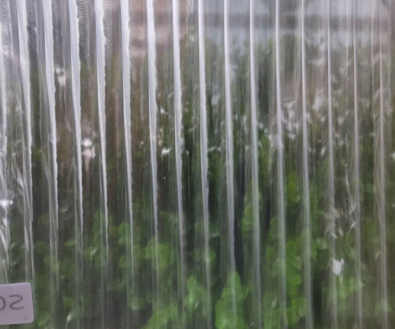 Визуальный облик пленки S045 определяет строгий, геометричный узор, состоящий из вертикальных рифлений, которые формируют четкие параллельные линии. Это создает современный, ритмичный и графичный дизайн, напоминающий гофрированный материал, такой как профилированный поликарбонат или стекло «мору». Поверхность обладает глянцевой отделкой, которая активно отражает свет, придавая изображению блестящий, почти зеркальный вид с выраженными бликами. Текстура материала однородна, гладкая в каждом изгибе, что придает узору дополнительную глубину и визуальный интерес за счет игры света и тени. Полупрозрачная основа обеспечивает необходимую конфиденциальность, мягко фильтруя задний план и естественное освещение. Такой дизайн добавит интерьеру органичности, современности и утонченной, индустриальной или архитектурной эстетики, сохраняя при этом функциональность зонирования пространства.